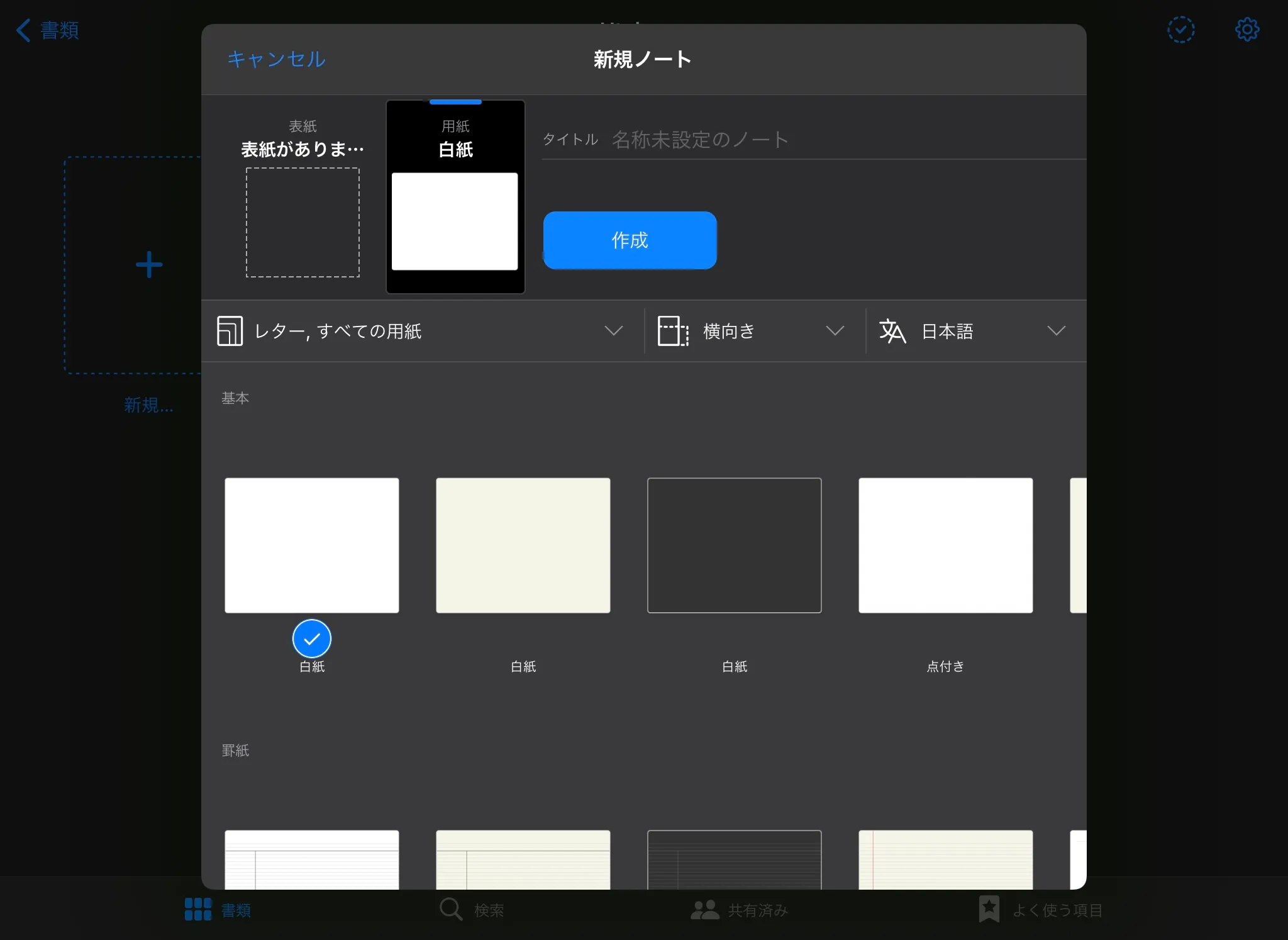 4. 表紙の有無や,用紙の色やサイズ,縦・横の向き,けい線の種類等を選択し,「作成」をタップします.