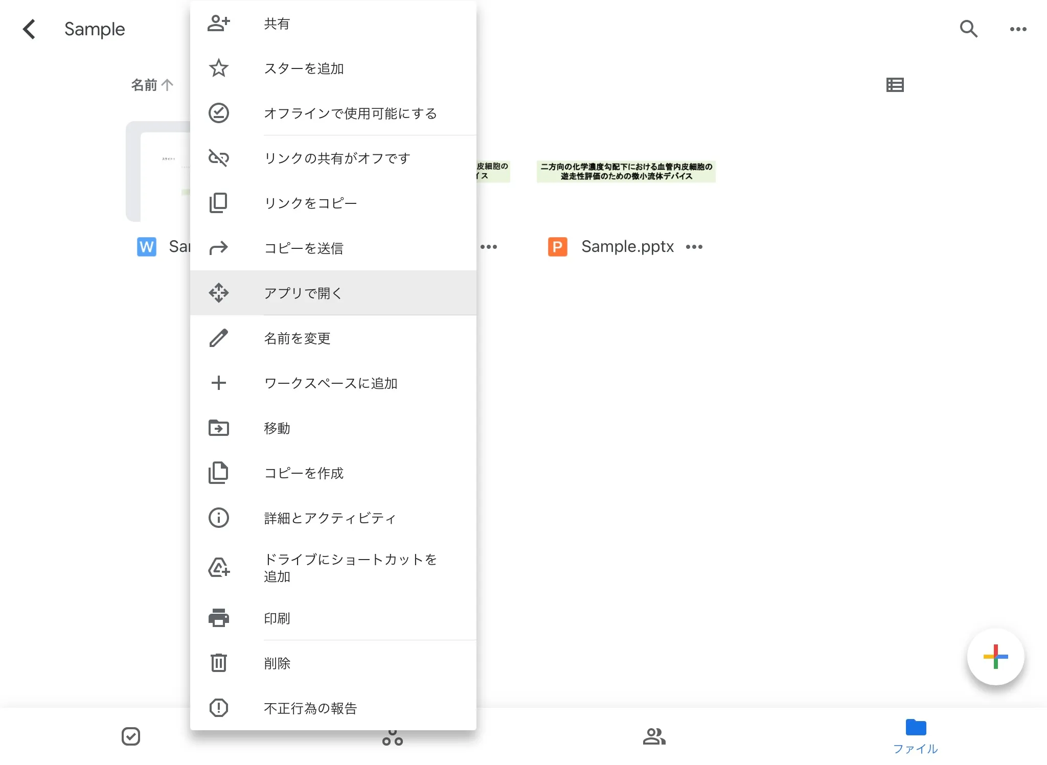 3. Google ドライブ上で開きたいファイル(PDF,Power Point,またはWordのファイル)があるフォルダまで移動し,開きたいファイルのファイル名の横に表示されている「・・・」をタップします.