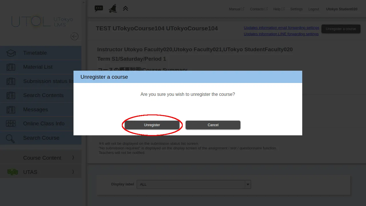 - This is a “self-registration” that can be made by clicking the button “Register a course” on UTOL. (This registration may be deleted after the enrollment registration period.)