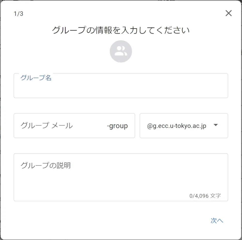 「グループを作成」ボタンを押してください.表示される画面で以下の内容を入力して,「次へ」を押してください.