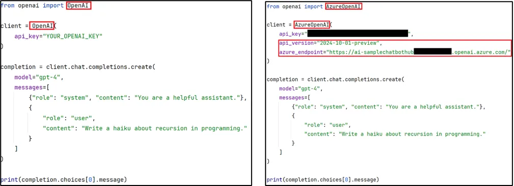 • Python でコーディングします.以下はコーディングの一例で,左が OpenAI クラスを利用した場合,右が Azure 互換の OpenAI を利用した場合です.