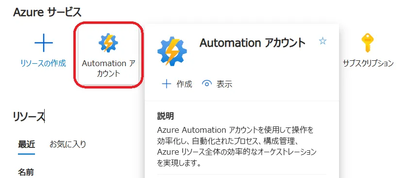 Automation アカウントを選択し,Automation アカウントの作成をクリックします - 一覧に無い場合、画面上部にある検索欄で検索するか,一覧の右にある