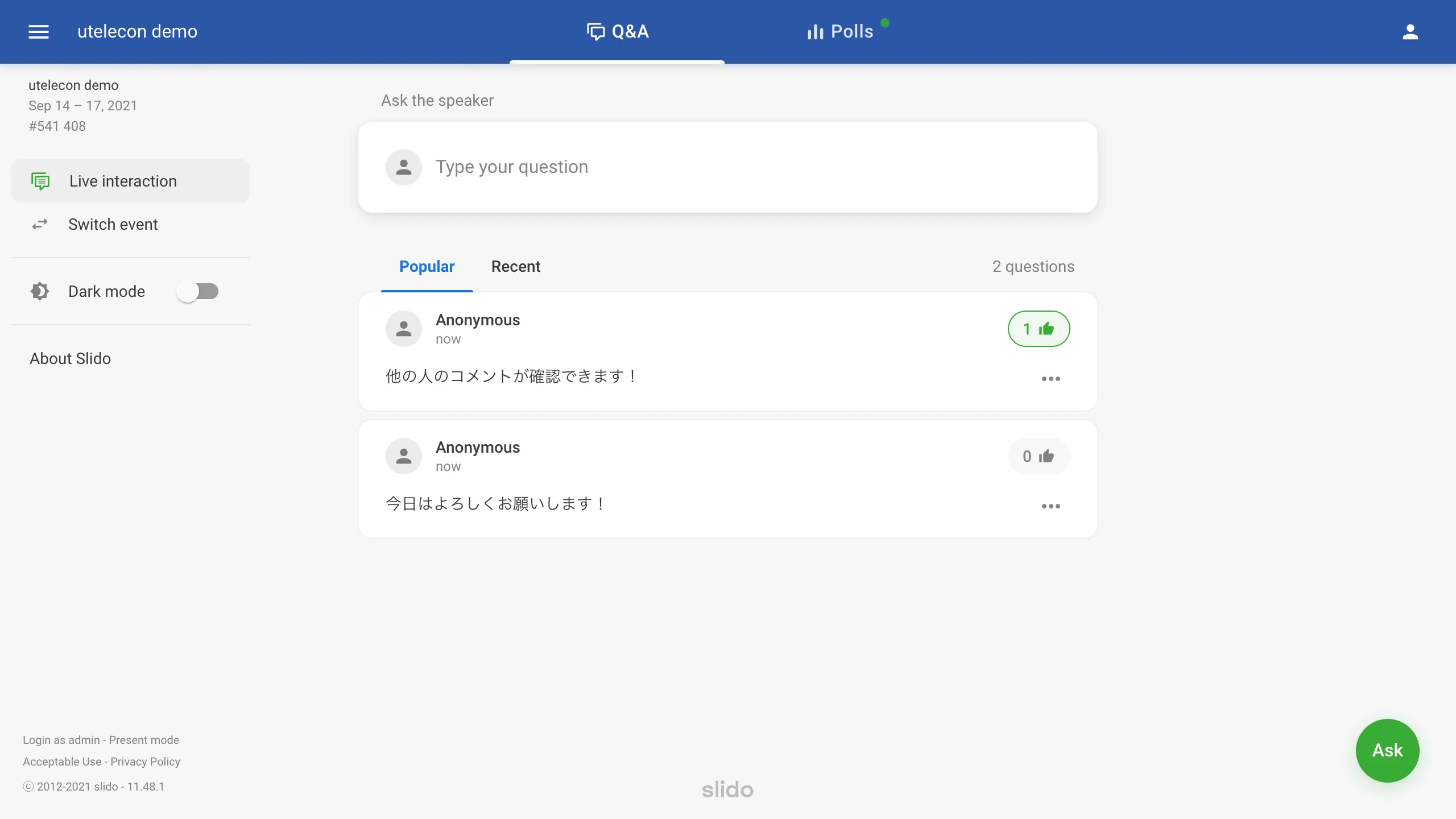 Slidoの画面でどのようなことができるかについては,「Slidoで受講者ができること」をご覧ください.