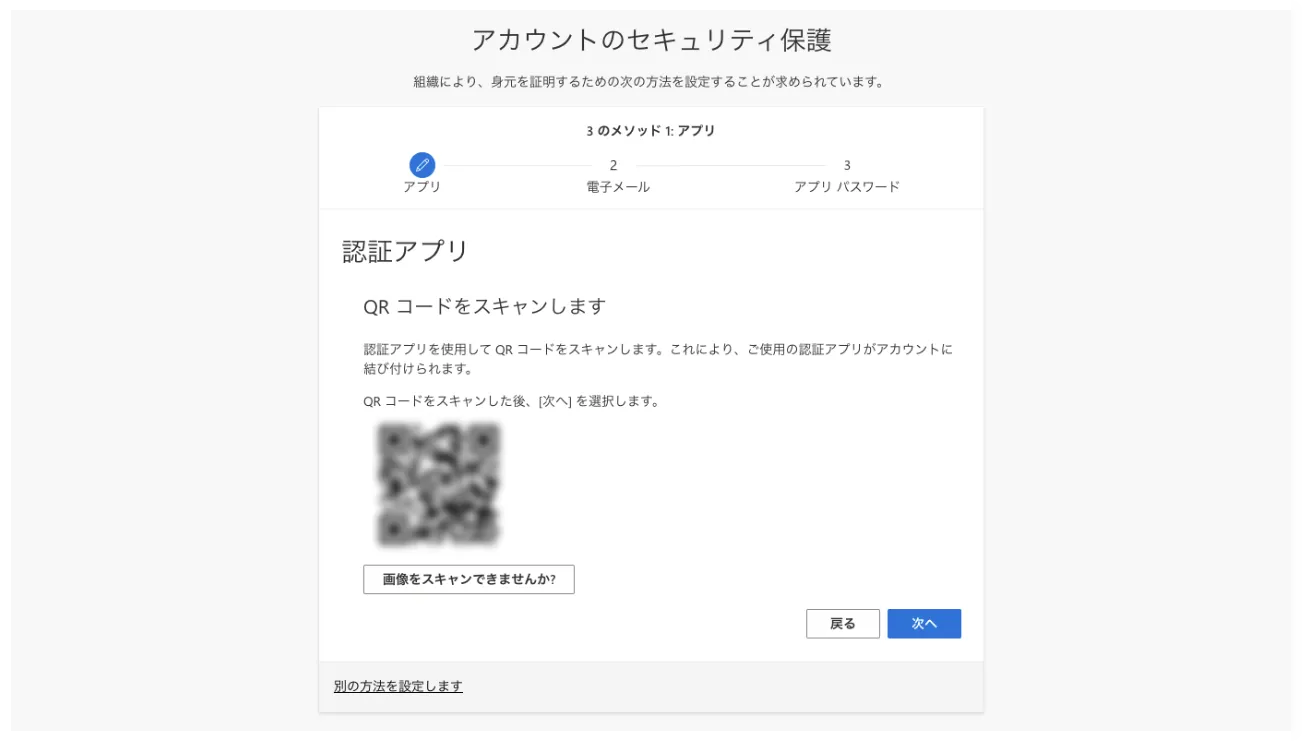 まず,多要素認証で使う本人確認方法(SMSや専用の認証アプリ)を設定します.ここではまず1個目の本人確認方法を設定し,この後の手順2で2個目以降を設定します.