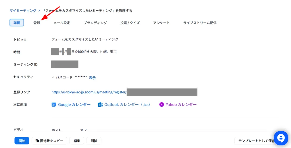 3. ミーティングの情報が表示されます.上の方に「登録」「メール設定」等のタブが並んでいます.「登録」タブを選択してください.