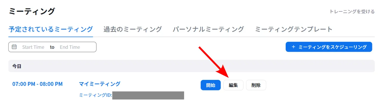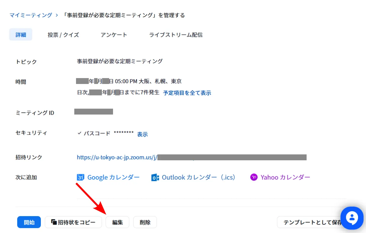 2. 参加者の登録機能を有効にしたいミーティングにマウスを重ねると,右側に「編集」ボタンが表示されます.このボタンを押してください.