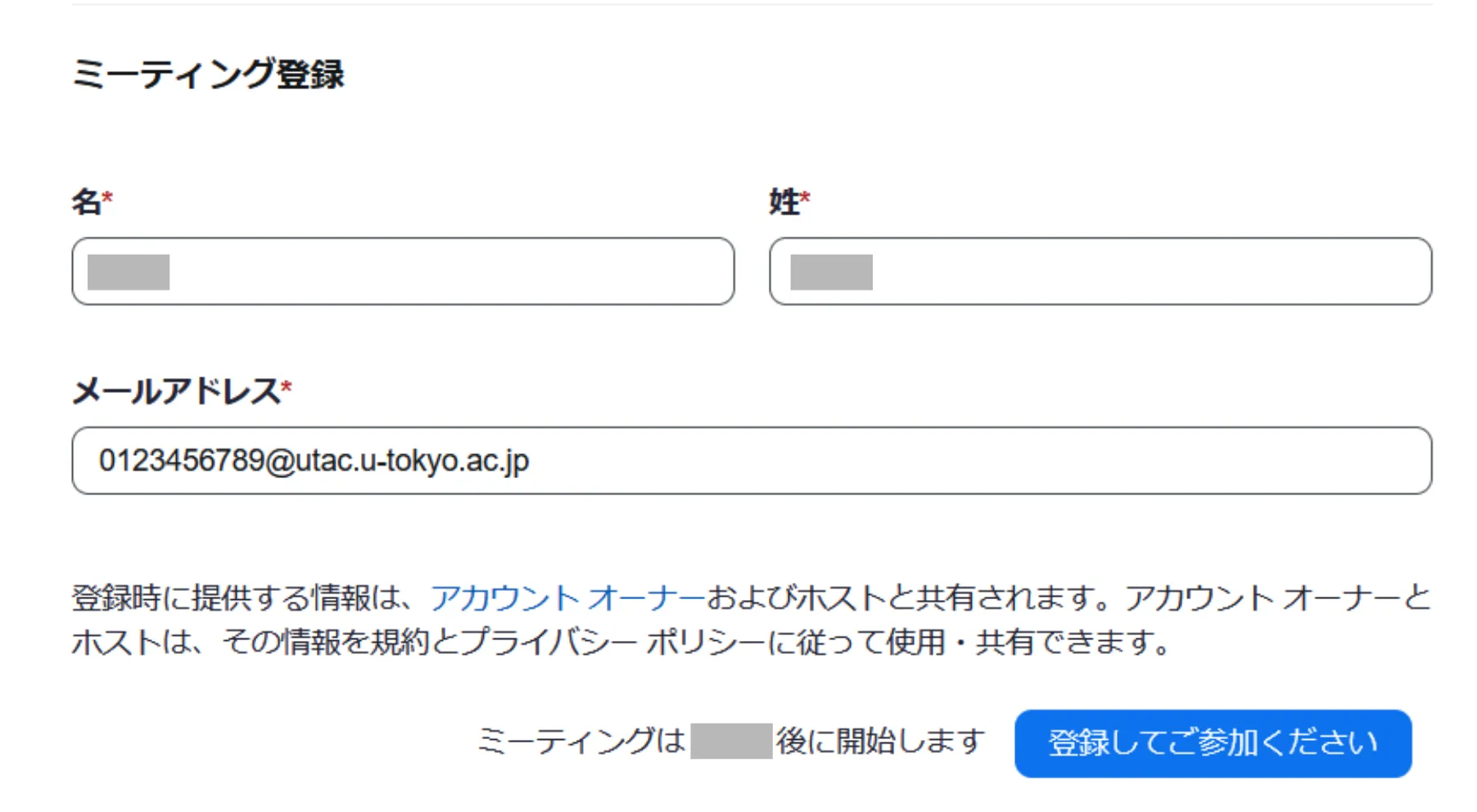 2. 図のような画面が表示されます.入力欄に自分の情報を入力し,下にある「登録してご参加ください」ボタンを押してください. メールアドレスの欄には,自分のメールアドレスを入力してください. 東京大学の構成員はUTokyo Account(10桁の共通ID+@utac.u-tokyo.ac.jp)を入力してください.