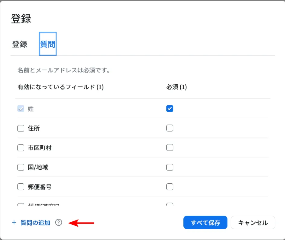 2. 追加可能な質問(「国/地域」,「会社名/学校名」など)が一覧で表示されます.