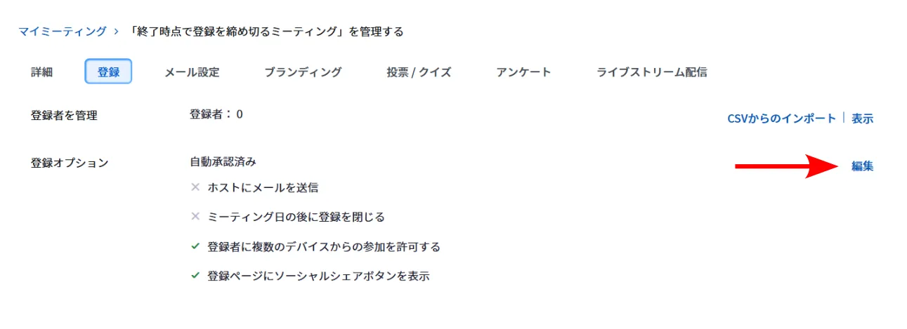 すでに作成されたミーティングで「参加者の登録」機能を有効にする場合(非推奨)