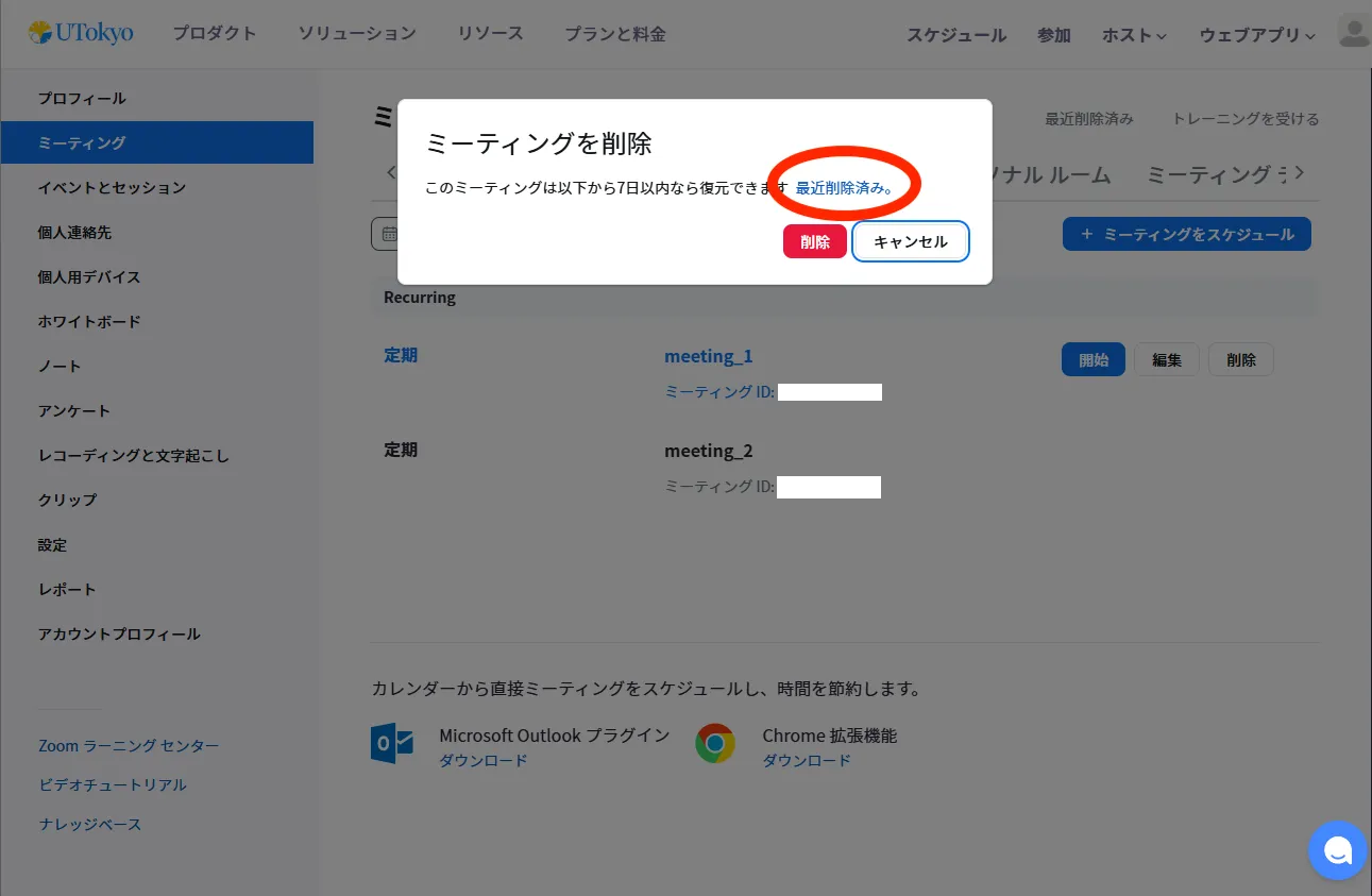 • ミーティング名の横にある「削除」を押すと,7日間の経過を待たず完全に削除できます.