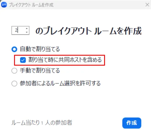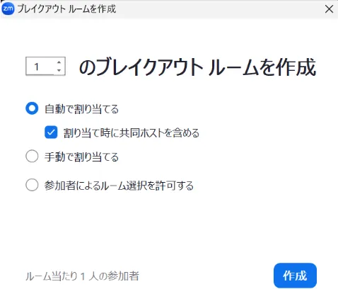 次に,作成するブレイクアウトルームの数と,参加者をどのように割り当てるかを選択してください.
