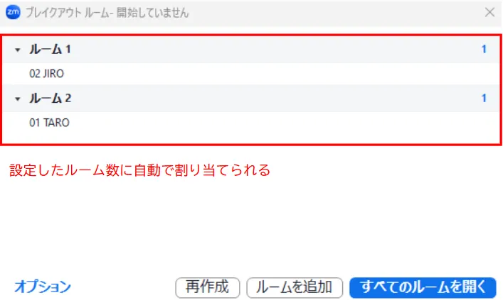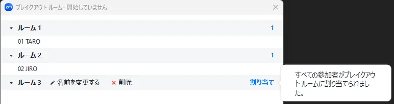 - 割り当てたい参加者が全員ブレイクアウトルームに割り当てられていることを確認してください.