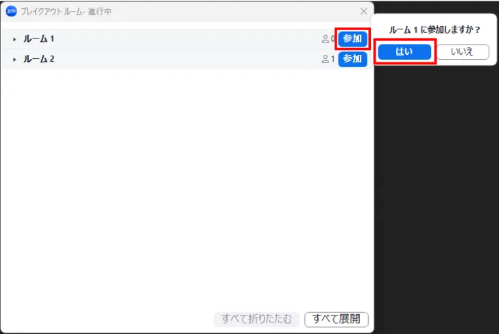 - 現在開かれているブレイクアウトルームの一覧が表示されるので,参加したいルームの横にある「参加」を選択し,「はい」を押してください.