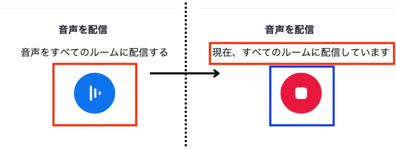 - 「音声を配信」する場合:ミュートが解除されていることを確認した後,音声配信アイコン(図中左赤枠のアイコン)を押してください.「現在、すべてのルームに配信しています」と表示されたら,正しく配信することができています.音声の配信を停止するときは,停止アイコン(図中青枠)を押してください.