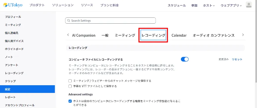 - Zoomのウェブポータルの「設定」から,「レコーディング」を開いてください.