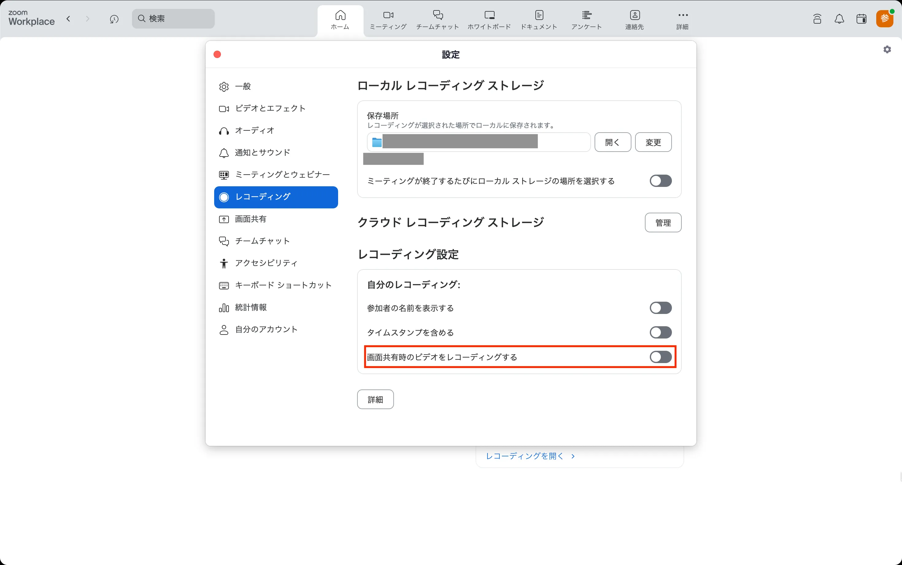 3. 「画面共有時のビデオをレコーディングする」を無効にしてください.